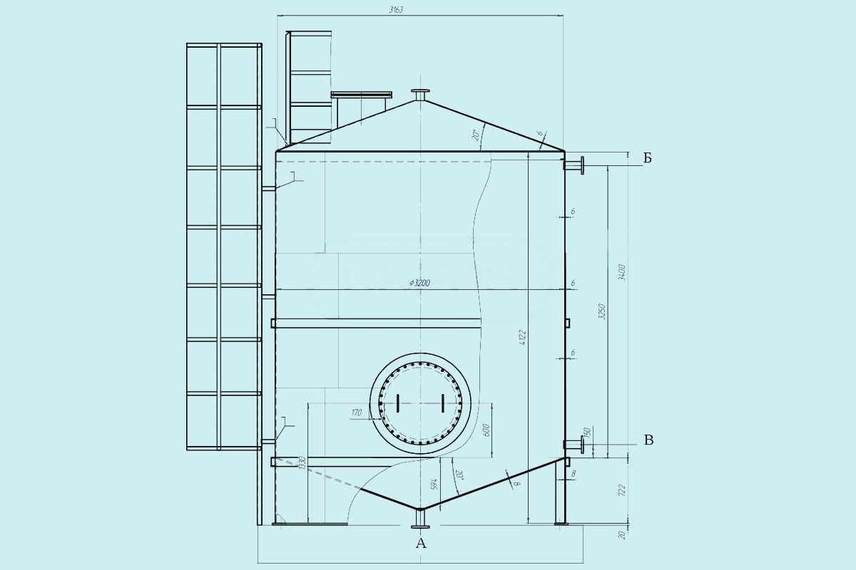 А-патрубок слива, Б-патрубок для установки уровнемера, В-патрубок для налива